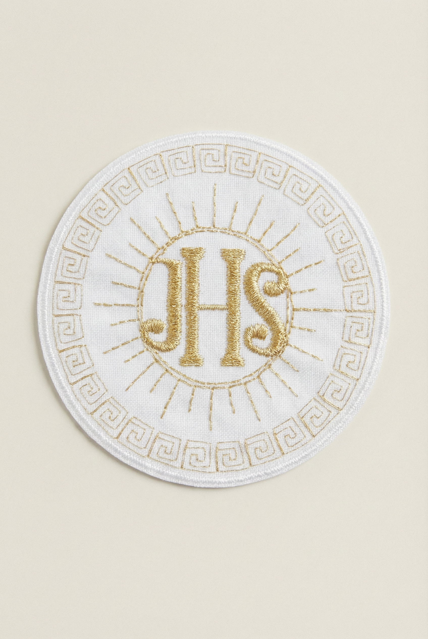 Crafted with the precision expected of high-end British tailoring, this delicate fabric emblem features the sacred IHS monogram, beautifully embroidered with shimmering gold threads against a pristine white background. It speaks to the tradition and solemnity of the ceremony, ensuring your child looks angelic as they step forward in faith.